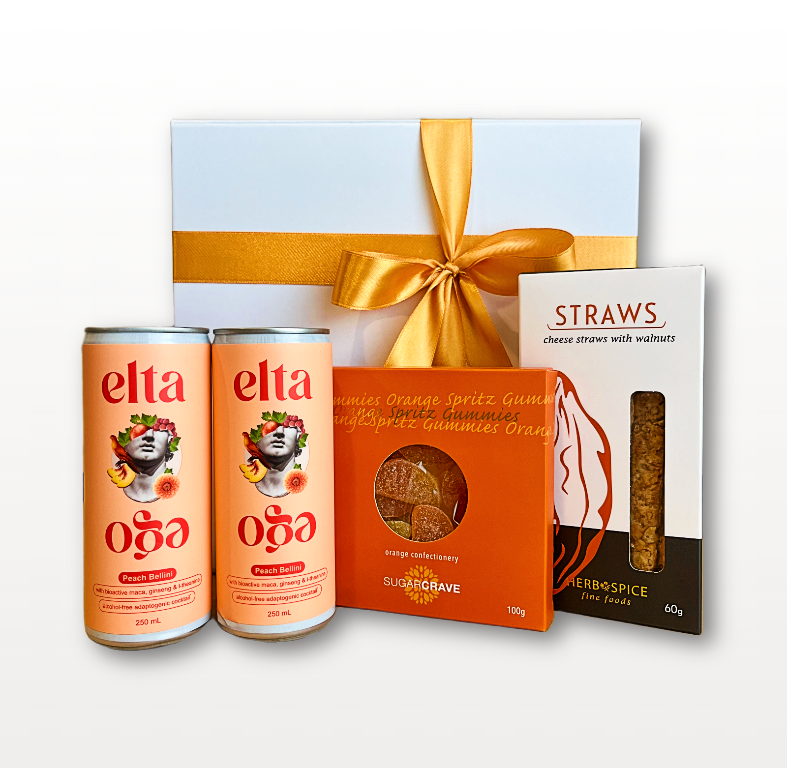 The Peach Bellini brings light, refreshing sparkle, while the citrus gummies enhance the fruity profile with bright, zesty notes. The herb and cheese straws introduce a savoury contrast, balancing the sweetness and completing the experience.