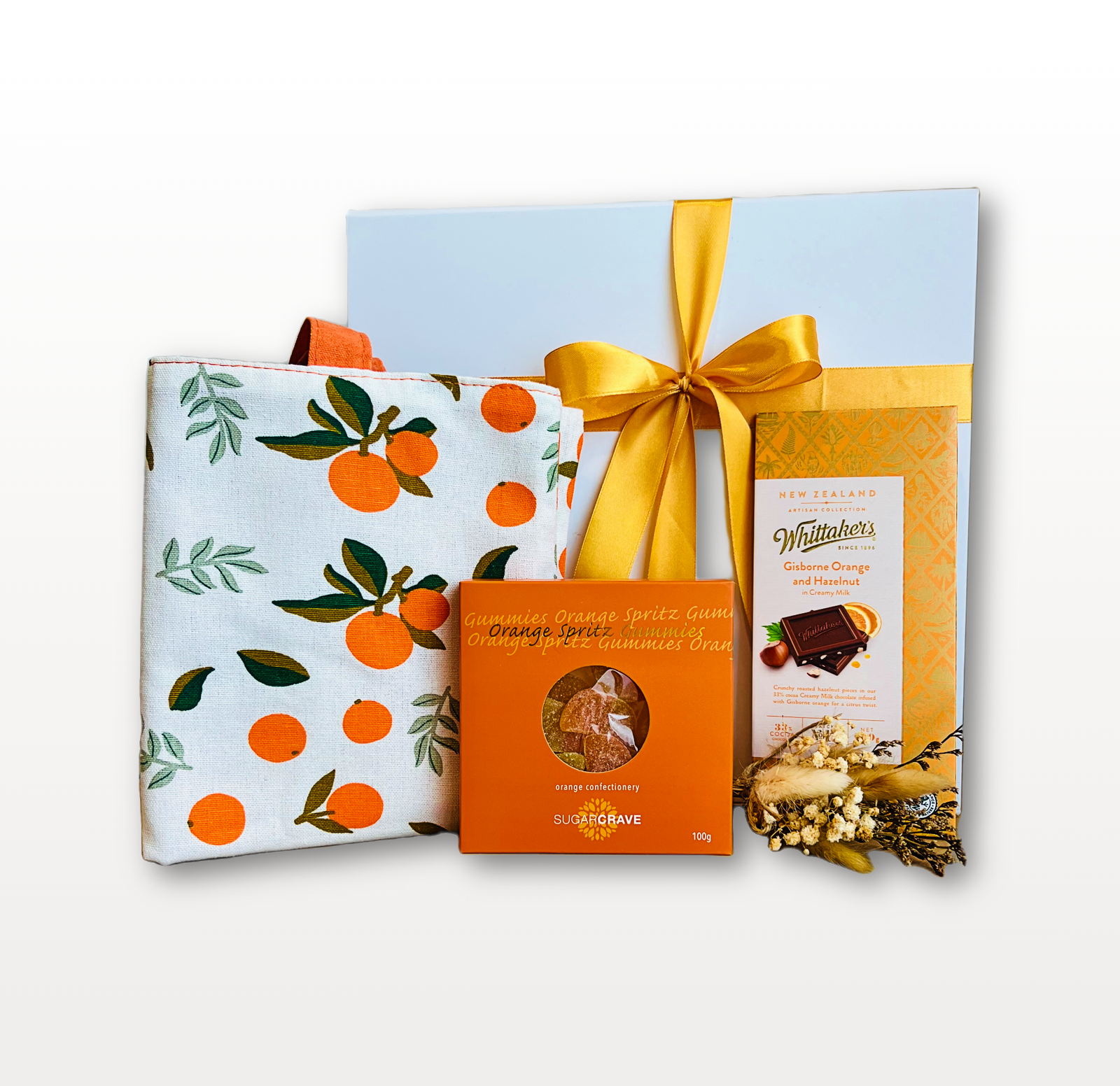 The dried flower bouquet softens the presentation with an elegant touch, and the orange bag enhances the overall theme with a bold and cheerful finish.