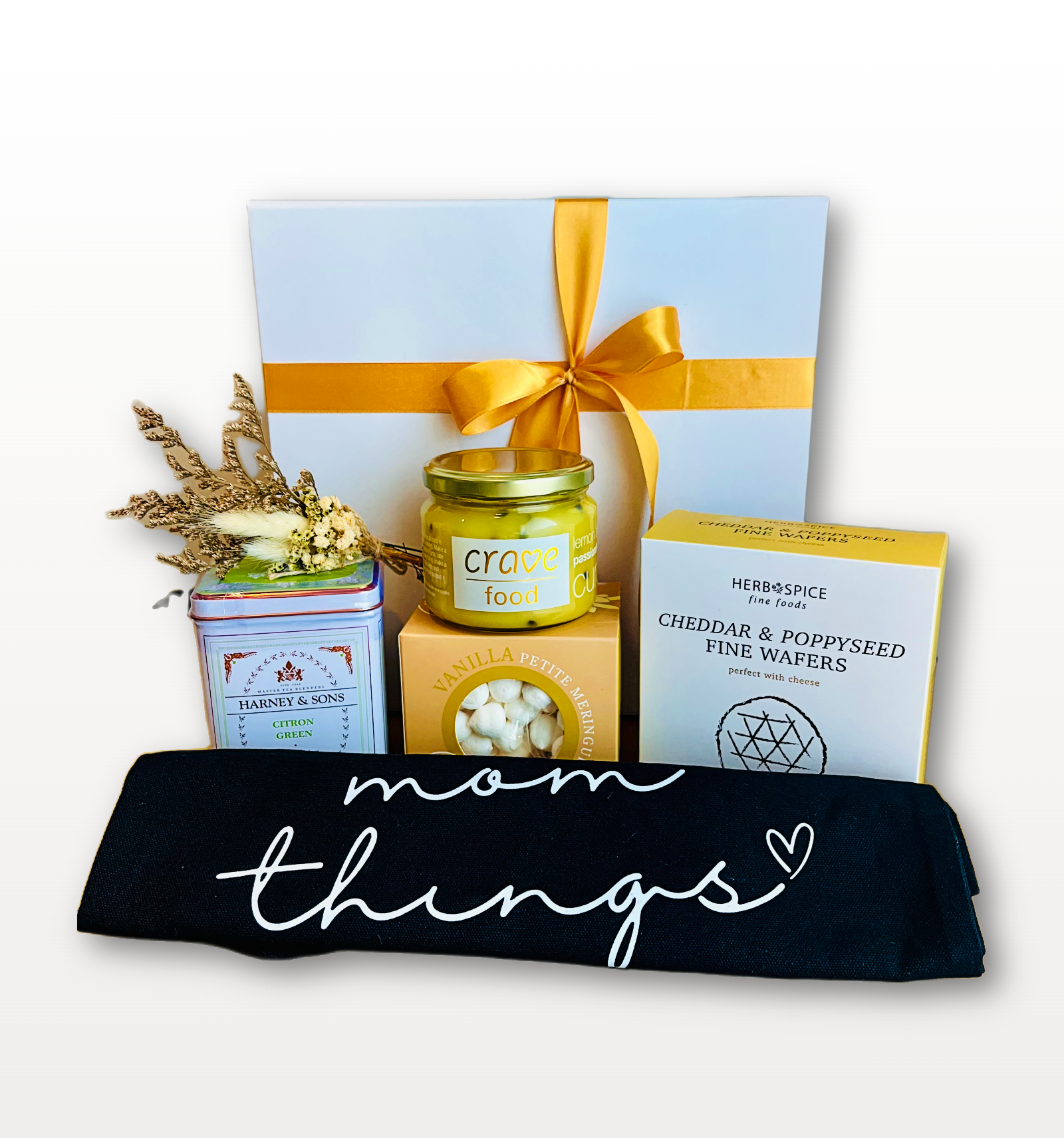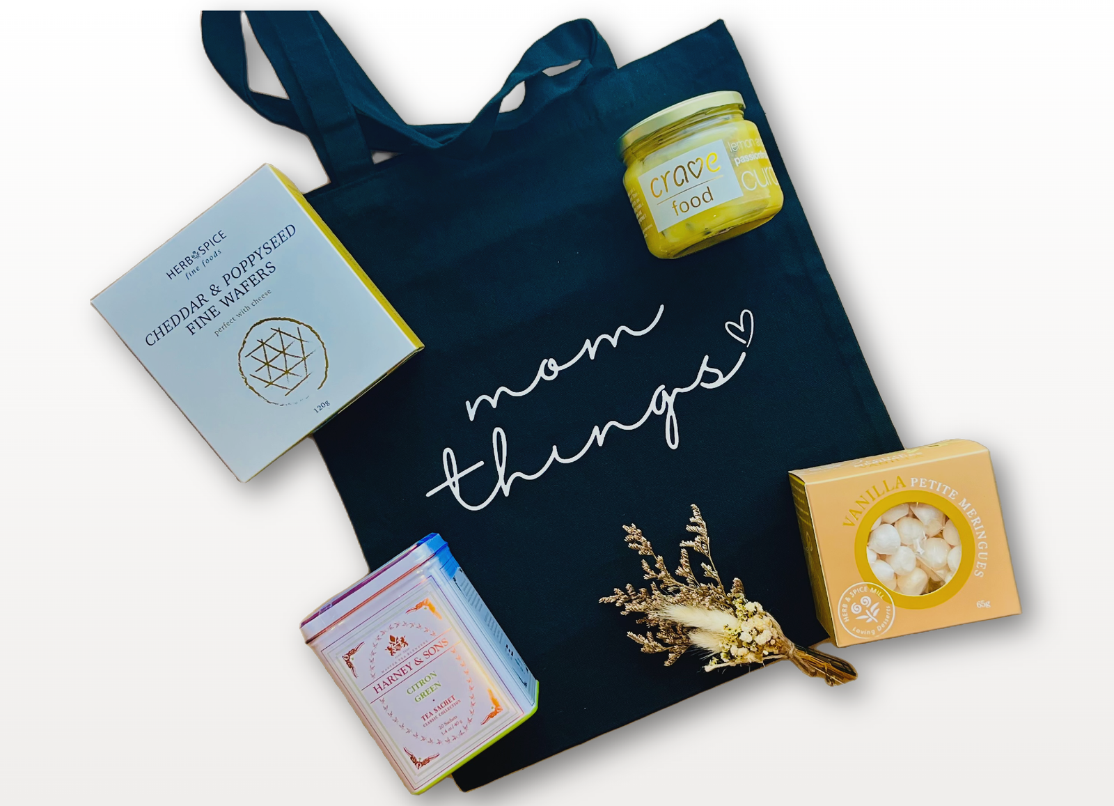 The dried flower bouquet and “Mom Things” black bag complete the presentation, adding both elegance and a practical keepsake that extends beyond the treats.
